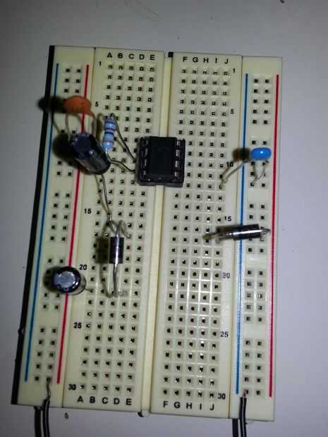 4. conectar la clavija de D1 sin plata (puede ser blanco) banda a Vin y el pin (con banda) en un punto libre en el protoboard