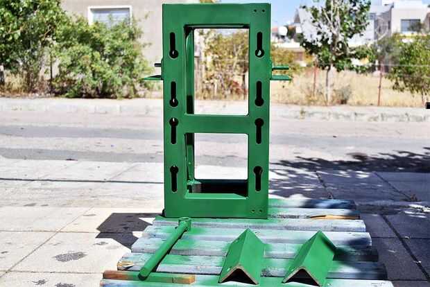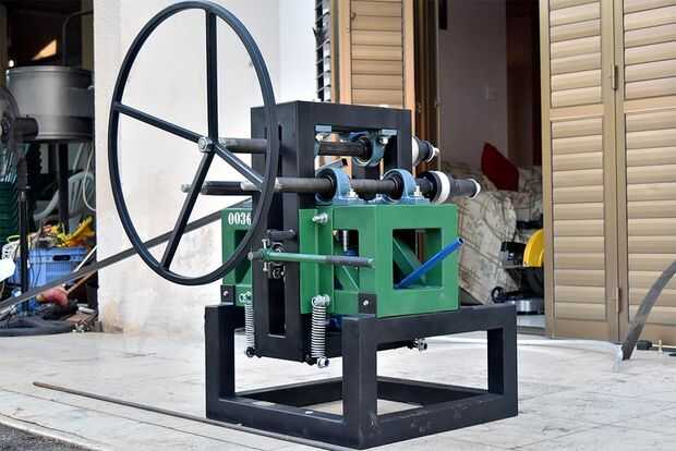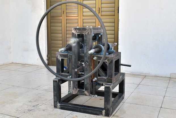 En los dos bordes de los tres ejes, colocamos los tornillos e hicimos canales especiales para cuñas para poder poner los accesorios según la forma y el grosor de los objetos metálicos que tenemos que doblar. Toma ventaja de nuestra estructura, hicimos una rueda que se coloca en el eje central que se encuentra en el marco móvil. Como resultado, dando la inclinación que preferimos y orbitando alrededor de la rueda continuamente, gestionamos una inclinación constante en los objetos metálicos que queremos doblar como tubos, tubos cuadrados, cuchillas y otros. Ambos lados de los ejes se han modificado, un lado puede ser utilizado para una nueva máquina en el futuro.