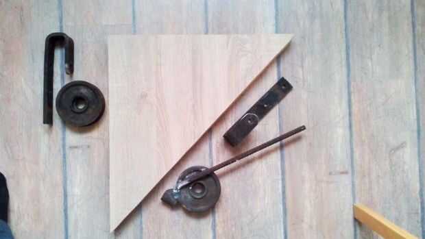 Primera vez que fui a chatarra metal depot para encontrar los materiales necesarios. Encontré allí algunas piezas oxidadas. En casa prepara las otras piezas. Doblé los talones afilados de la base de madera laminada, y mis amigos y su papá me ayudaron a soldar un mango y una pieza más en la rueda principal de la formación.