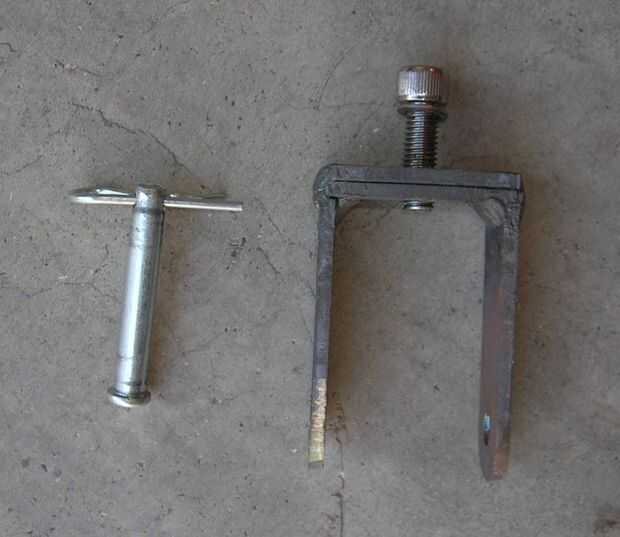 La pinza se hace de un par de pedazo de la barra de acción. Dependiendo de lo grueso y alto el hierro de ángulo es que vas a tener que modificar las dimensiones de esta parte. Pero básicamente soldar las cuatro piezas juntas, dos piernas y la parte superior la parte que es de dos piezas doblado para arriba. Después se enfría, puede redondear la parte inferior en una amoladora y taladro para el pasador de horquilla. Taladro y golpee la parte superior para el tornillo de sujeción. Si no tienes el tamaño de la llave correcta, solo soldar o soldar una tuerca en la parte superior en lugar