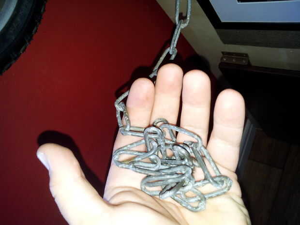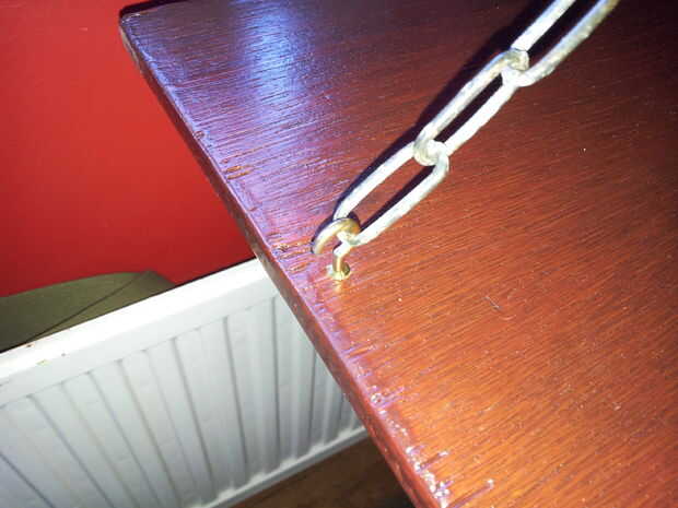 La cadena está enganchada en un gancho pequeño de latón que se atornilla sobre el borde de la mesa mientras que el otro extremo se sujeta en
