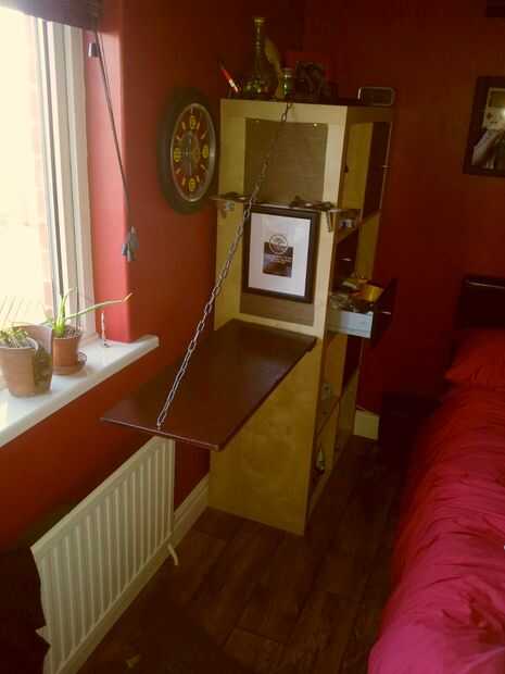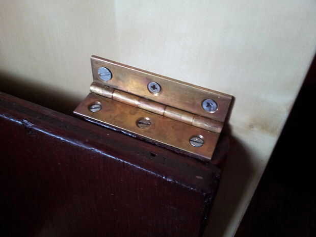 Usé dos bisagras de latón, con 6 tornillos de acero cada uno. Usé una cadena de enlace de 3 cm de largo de 1 m a mantener erguido el escritorio.