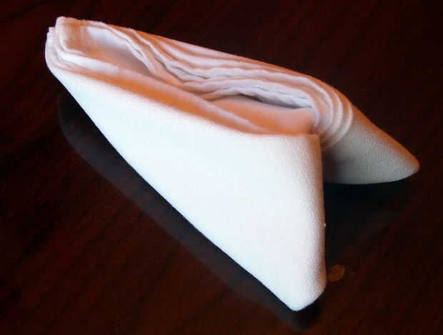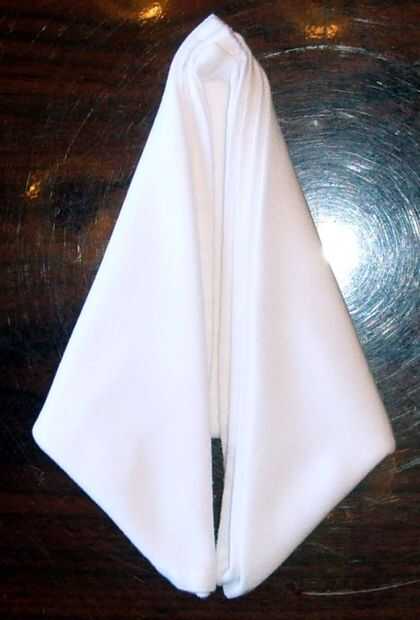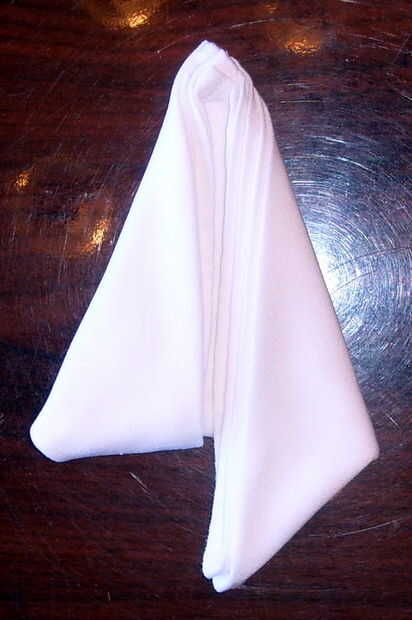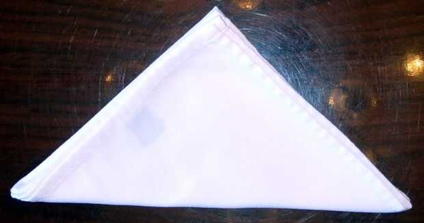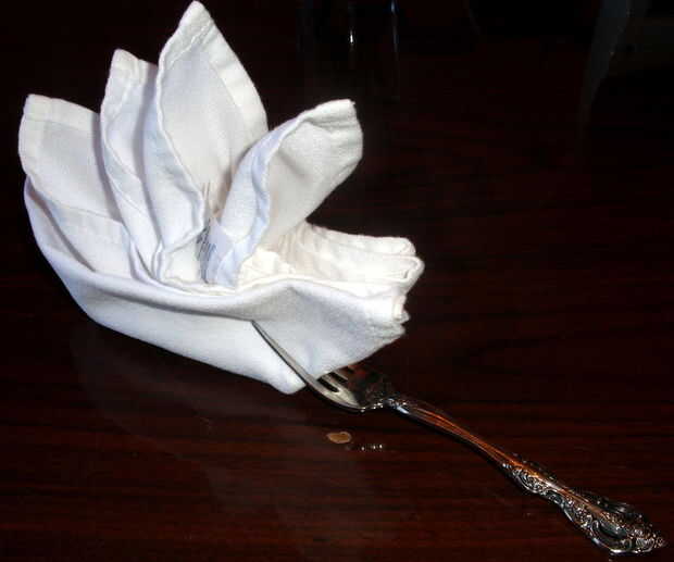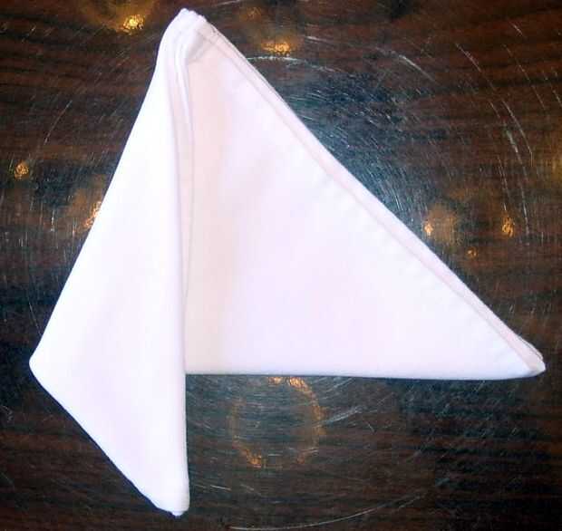 Si la servilleta acepta pliegues bien y tiende a permanecer donde lo pones, los cachitos que cuelguen sobre el borde inferior debajo del doblez. Si la servilleta es muy elástico o muy blando, dejar éstos sobresale y robar una limpieza de la horquilla de la siguiente tabla si ya has usado tuyo.