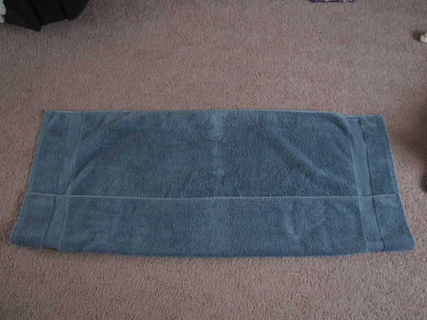 Comenzar con una toalla de baño grande tendido horizontalmente en el piso. Doblar en tres partes y van a colgarlo en el toallero de barra.