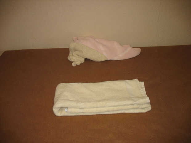 hace años yo me crié en el antiguo arte de doblar toallas.  Ahora muchos años después la niebla del tiempo ha tomado mucho de este arte de mi memorries.  Todo lo que está a la izquierda es... un pollo.Paso 1: Se necesita 1) dispuesta hacia fuera plan