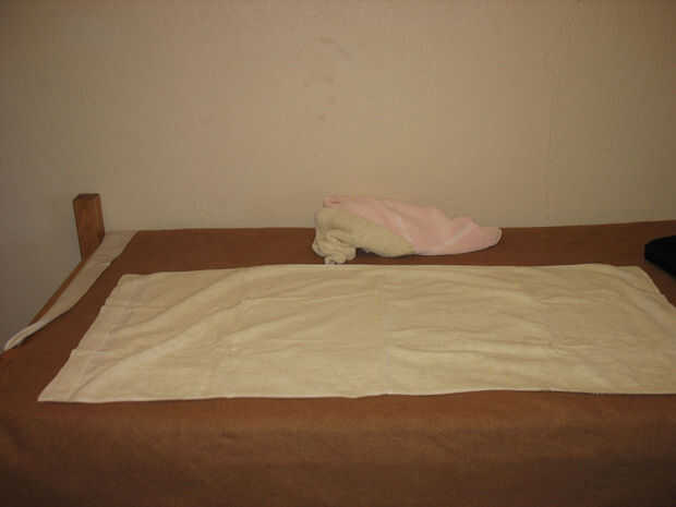 hace años yo me crié en el antiguo arte de doblar toallas.  Ahora muchos años después la niebla del tiempo ha tomado mucho de este arte de mi memorries.  Todo lo que está a la izquierda es... un pollo.Paso 1: Se necesita 1) dispuesta hacia fuera plan