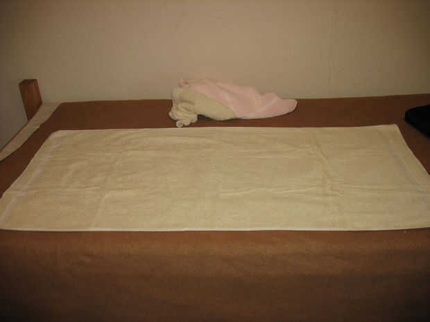 hace años yo me crié en el antiguo arte de doblar toallas.  Ahora muchos años después la niebla del tiempo ha tomado mucho de este arte de mi memorries.  Todo lo que está a la izquierda es... un pollo.Paso 1: Se necesita 1) dispuesta hacia fuera plan