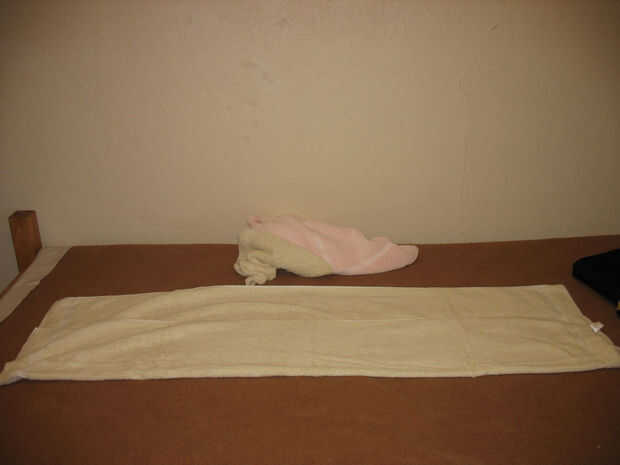 hace años yo me crié en el antiguo arte de doblar toallas.  Ahora muchos años después la niebla del tiempo ha tomado mucho de este arte de mi memorries.  Todo lo que está a la izquierda es... un pollo.Paso 1: Se necesita 1) dispuesta hacia fuera plan