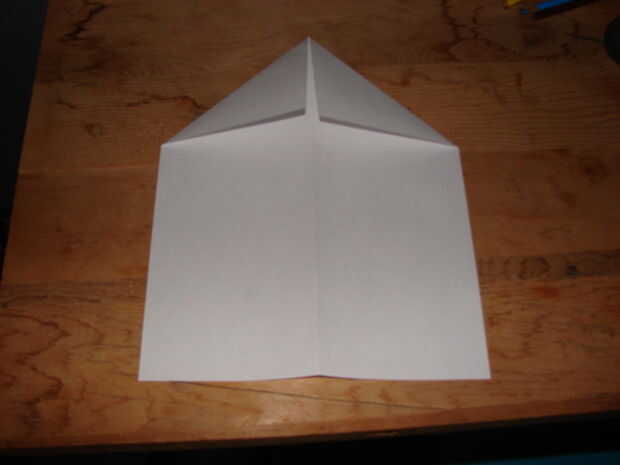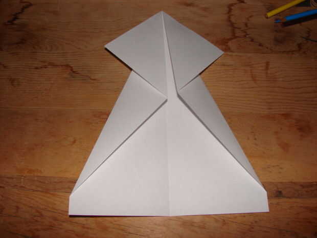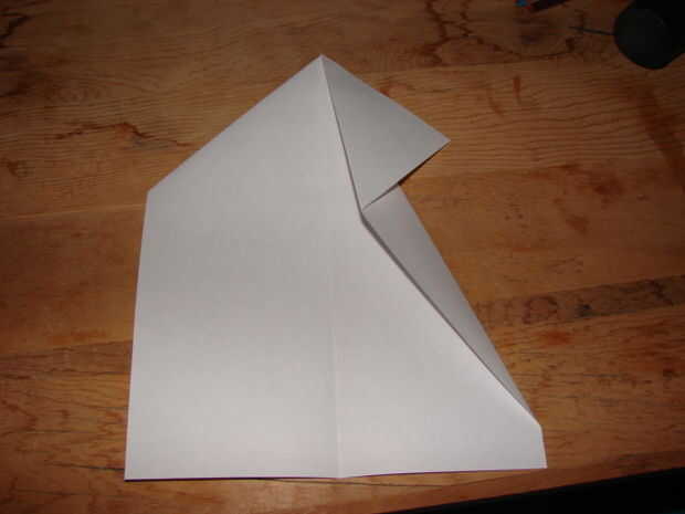 Dé vuelta el papel y doblar esquinas a arrugarse, lo que permite el doblez anterior sacar. Repita en el lado opuesto, el doblez anterior debe formar dos triángulos, como se muestra en la foto.