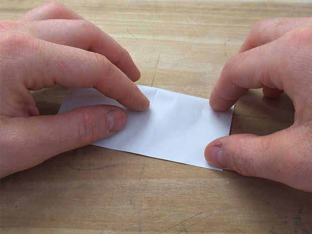 Luego dobla el papel por la mitad en la otra dirección, lado blanco hacia fuera. Despliegue y lisa plana.