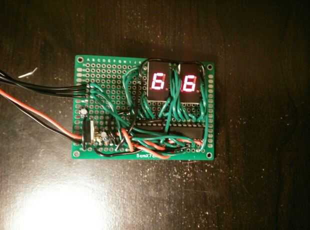 He creado una doble pantalla de 7 segmentos led controlada por un Arduino a través de dos registros de desplazamiento de 8 bits. La ventaja es que sólo utiliza 3 pines de Arduino. En lugar de utilizar 14 resistencias para los leds utilicé un regulador de voltaje para soltar la tensión de 2.1v sobre todo lo would't tiene que soldar todas las resistencias.