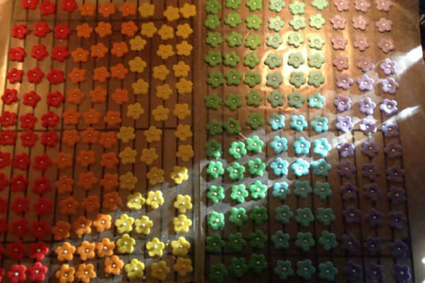* Un pequeño lenguado de agua en pasta de azúcar actuará como pegamento. Tenga cuidado de no usar demasiada agua, o los colores se ejecutarán y obtendrá rápida sucio.