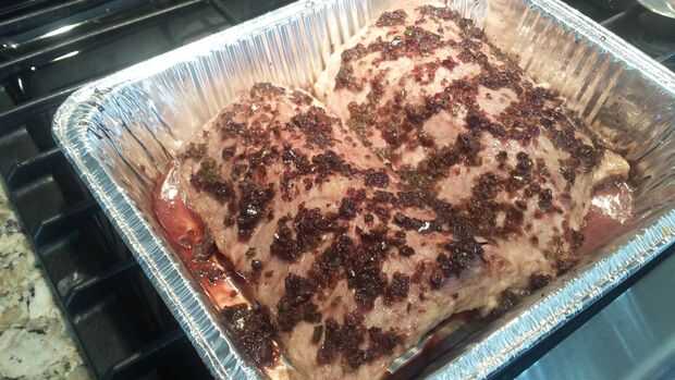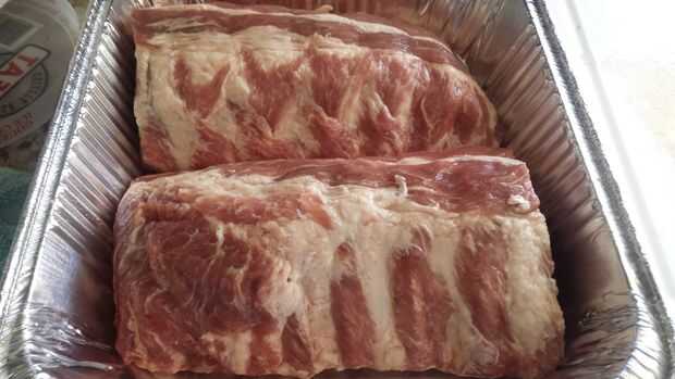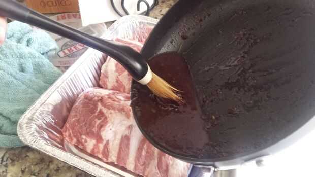 1. lavar las costillas y extender la mitad de su esmalte por ellos. Azúcar morena debe espolvoreado en la parte superior aquí junto con sal y pimienta. Una capa ligera es perfecta (azúcar no está en la foto, el esmalte en este punto). Tienes que cubrirlas completamente en esmalte. Su primer incendio debe asar ellos o barbacoa a 450 grados durante 10-15 minutos. Esto bloqueará en los jugos.
