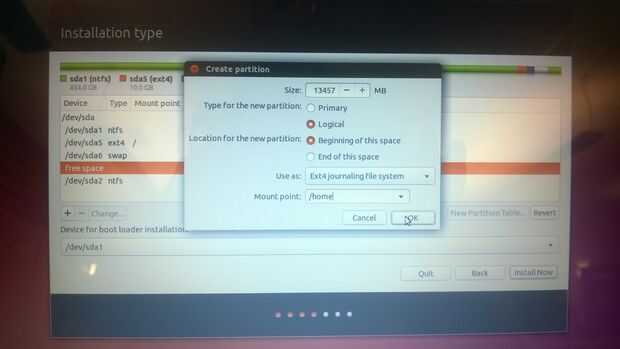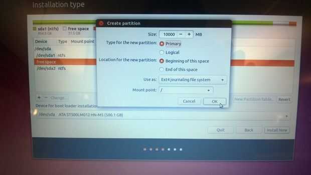 • En primer lugar hacer un espacio "/" de 10 GBs, se trata de la "raíz". En la parte de usar como , seleccione sistema de archivos journaling EXT 4y golpeó el "ok".