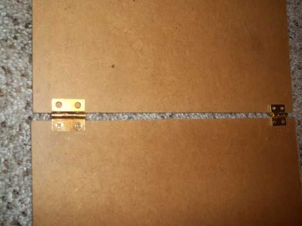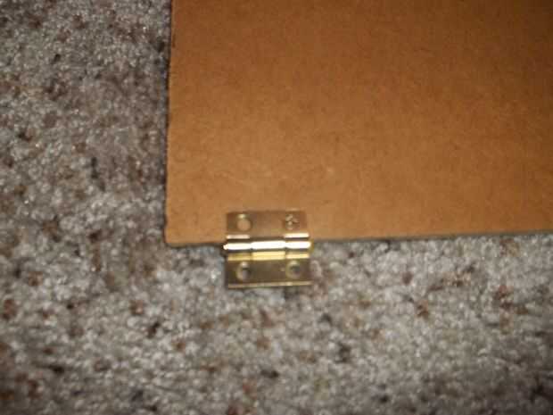 siguiente tornillo en 2 pequeñas bisagras cada uno aproximadamente una pulgada de los lados de la madera.  Asegúrese que sus tornillos no son demasiado largos y que su madera se cerrar completamente y abrir a 90 grados.