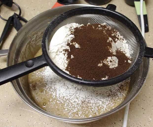 Combinar la harina, bicarbonato, polvo de hornear, polvo de café y sal en un colador y tamizar sobre el líquido. Doblar suavemente los ingredientes secos a la masa.