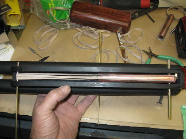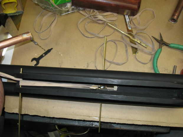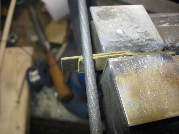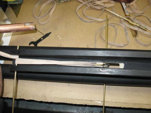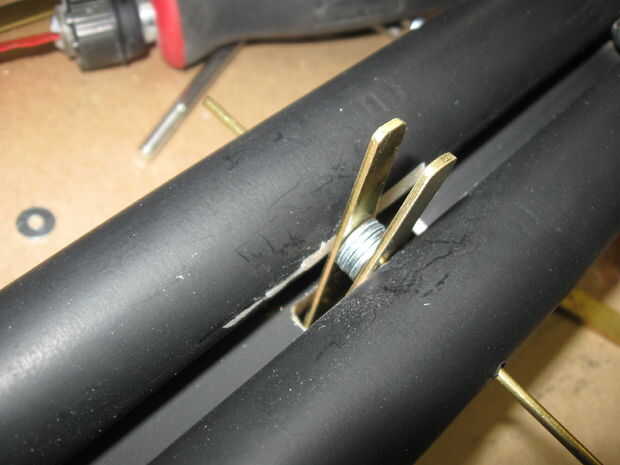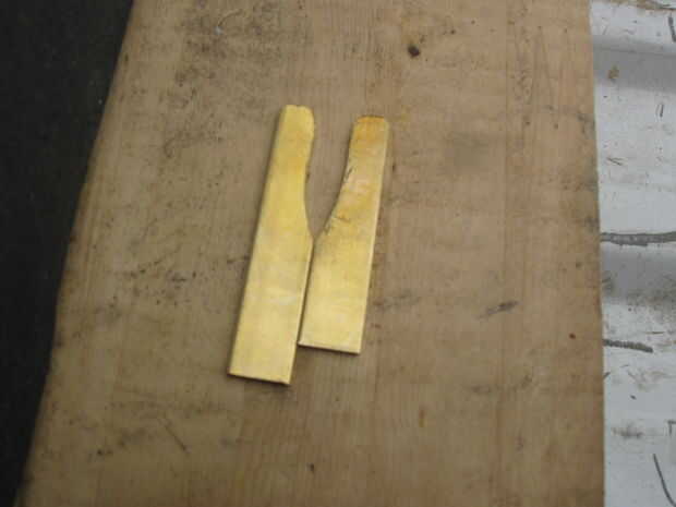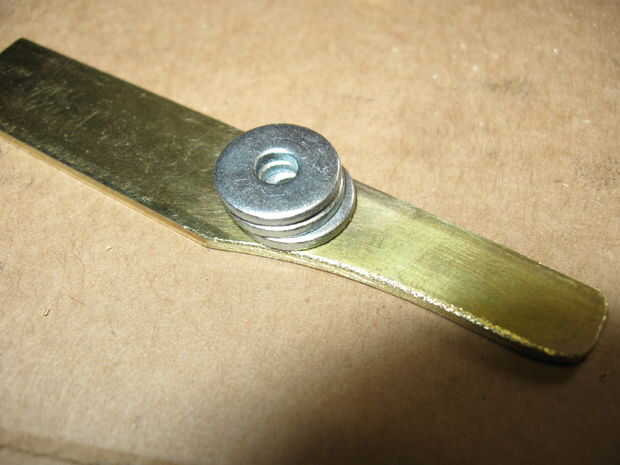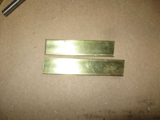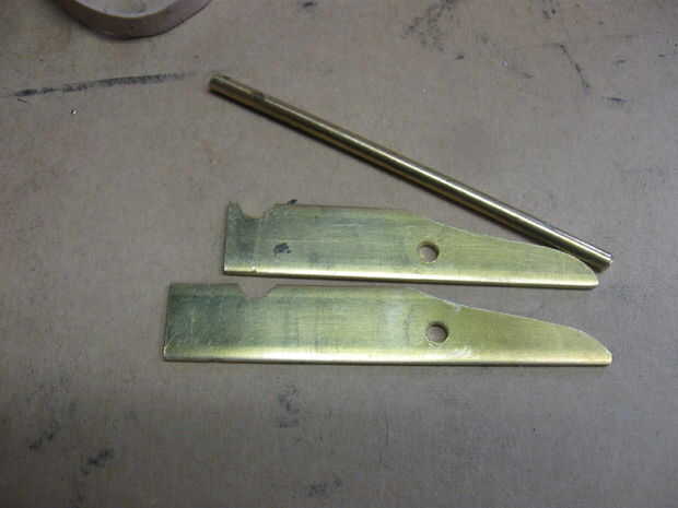 forma y perfore 2 piezas de latón duro como se muestra como los retenedores elásticos. uno es aproximadamente 1/4 de pulgada más larga que la otra.