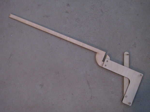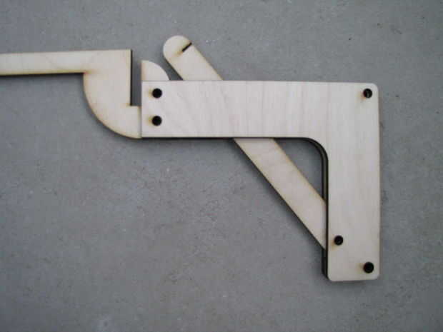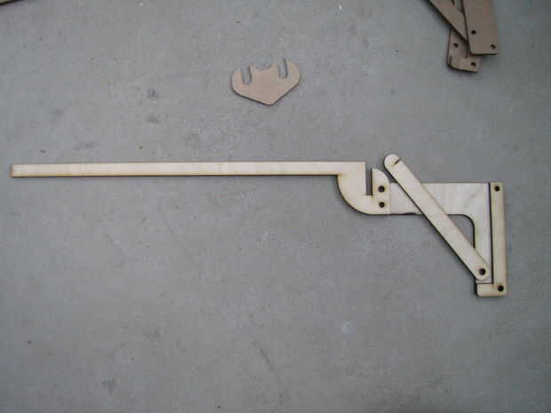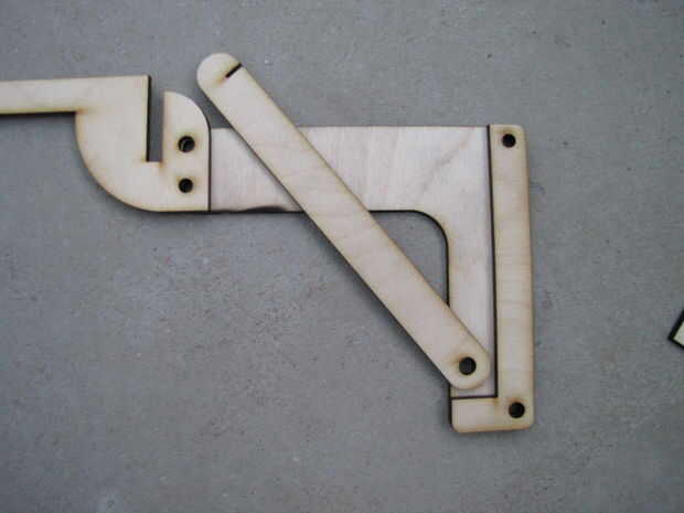 Usé trozos cortos de espiga de 6mm para apoyo de las partes. El ajuste de los agujeros cortados con láser fue ajustado, usé un mazo de goma para conseguir en su lugar, proteger la pistola con un trozo de madera. Madera-pegamento entre las capas garantiza una solución permanente.
