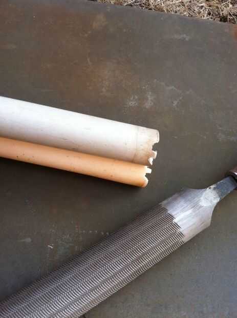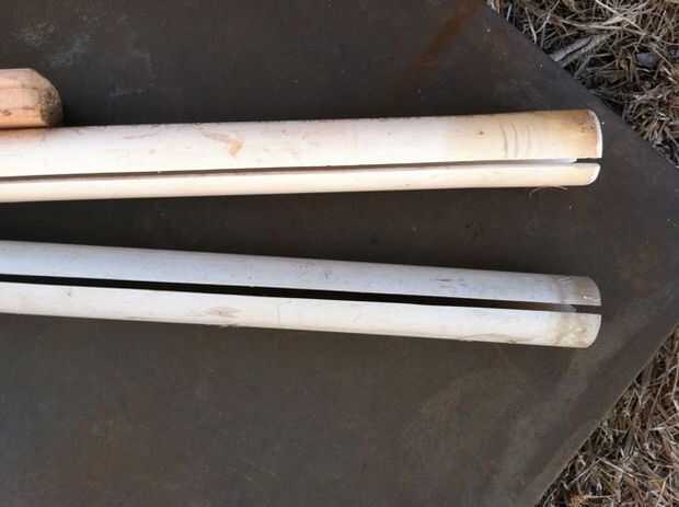 Cortar los cañones de PVC a la longitud, luego presentó dos nocks poco en los extremos de los barriles para enganchar las gomas para dispararles. Fue necesario cortar ranuras en los lados de los barriles para cargar las bandas de goma dentro de los barriles. En este momento, corte de V en el extremo posterior de los barriles en los extremos de las ranuras para cargar las bandas de caucho más fácil. No sabe que, pero cortarlas más tarde cuando empecé a juicio dispara. (antes de pintar)