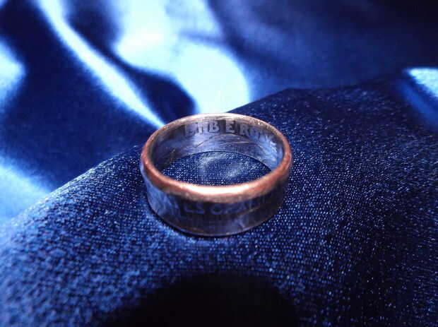 Aquí está el resultado final. Cada anillo se hace voluntad mejor y mejor como usted fine tune su proceso personal. Este anillo era una de mis primeras. Algo que he aprendido desde entonces es utilizar un papel de grano arena mucho más fino antes de terminar entonces no todo rayada por la parte de cobre.