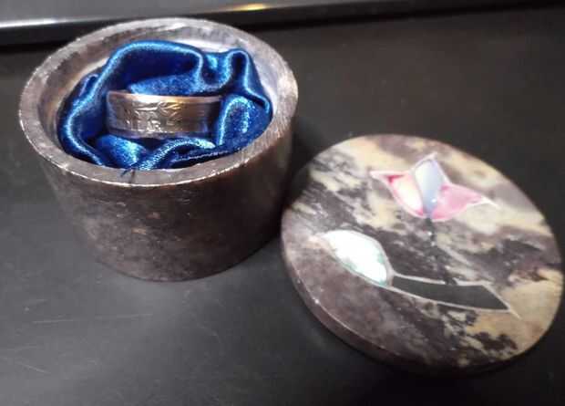 Algunos consejos que he aprendido después de hacer este anillo, frote las letras y levantado detalles ligeramente con lana de acero o papel de lija antes de pulir - esto hará que el contraste más destacado, uso cuero alrededor del anillo cuando se trabaja en el bloque abovedado y el mandril para evitar que se dañen, para que tamaños más pequeños comenzar con agujeros más pequeños y ajustar cómo trabajar el anillo. Más difícil golpee hacia abajo más la fuerza hacia abajo el mandril haciéndolo más grande.