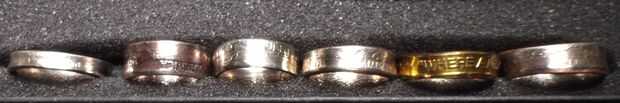 Estos son algunos otros anillos que he hecho, primero de la izquierda es un níquel, el resto son cuartos con la excepción de un token de arcade ChuckyCheese. La cosa agradable sobre el anillo de ChuckyCheese es el texto "Donde un niño puede ser un niño" los círculos del ring.
