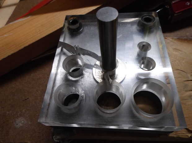 Para hacer el agujero utilizan un conjunto de punzón y matriz recogido del puerto de carga (9 piezas y juego de matrices - Artículo número 95547 actualmente $29,99). La parte superior clara ayuda a centro de la moneda. Tenga cuidado al usar el golpe como se puede ver a una señorita con el martillo hace de malos resultados.