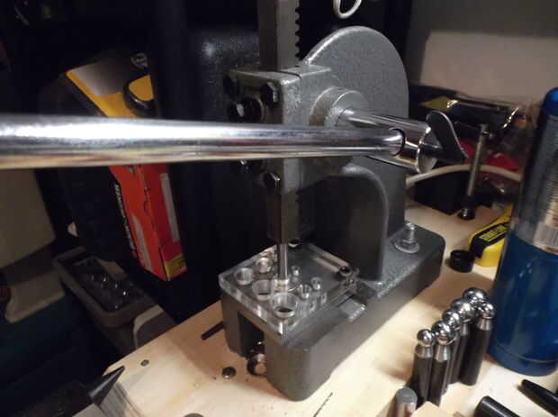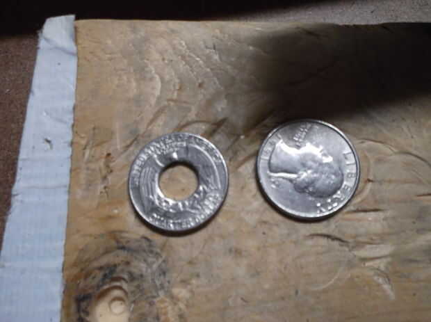 Posicionar la moneda con el punto negro en el centro lo mejor que pueda. Hay todavía un poco de ensayo y error aquí. Una vez que esté satisfecho con su colocación se proceder a "perforar" el agujero. Un martillo pequeño funciona bien para esto, pero he recogido una prensa (otra vez en el puerto de carga - 1/2 tonelada Arbor Press - $36,99) push punzón/troquel y cortar el agujero.