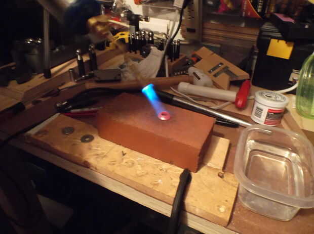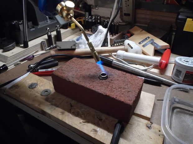 En este momento estoy recocido una segunda vez para hacer más fácil trabajar con el metal. Una vez calentado al rojo, enfriar en el agua, luego seque y empuje sobre mandril con la cara de la moneda que desea ser el exterior del aro hacia arriba. Empezar a martillar y trabaja su manera alrededor del anillo se fuerza abajo el mandril. Tratar de mantener el anillo incluso mientras trabaja. Este es el arte del proyecto y cada vez que lo haces va a mejorar en él.
