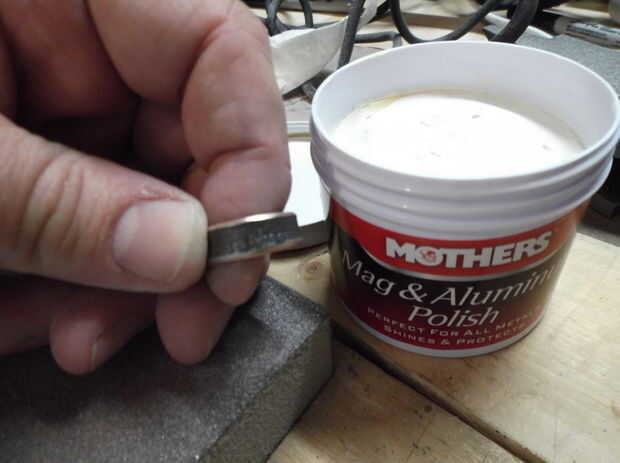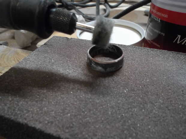 Una vez que estés feliz con tu anillo, es hora de limpiar. El anillo será más fácil de limpiar si usted no lo ha recocido. He utilizado las madres Metal polaco en ellos, hace maravillas. Aplique un poco y golpeó con el cepillo para dremel (puede también ser hecho a mano) y tiene un anillo nuevo.