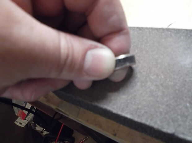 Ahora es el momento para los toques finales. El lado rugoso tiene un labio pequeño por lo que es agradable a la arena fuera un poco. Sostener el aro en 45 grados ángulo de frotarla contra un bloque de lijado como hacer girar en los dedos. Este proceso tomará algún tiempo. Mientras que ayuda a hacer la parte más gruesa un partido más cerca hacia el corte más fino también añade un elemento de diseño en el anillo. Si arena suficiente puede llegar a la parte de cobre del anillo. Repita este proceso en la parte inferior del anillo coincide con el diseño y suavizar los bordes más ásperos.