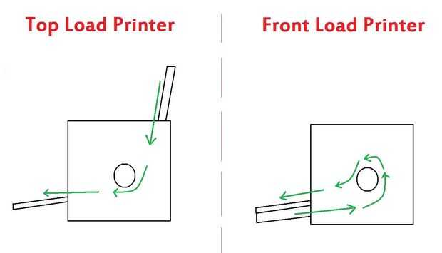 En una impresora de carga frontal, el papel cambia de dirección y voltea durante la impresión. Esto significa que el lado del papel hacia usted como va en la impresora será boca abajo cuando sale detrás.