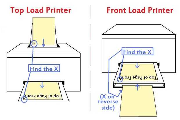 - Para una impresora de carga superior, voltee la página para que el X todavía está frente a usted, pero es ahora en la esquina inferior izquierda y la carga en la bandeja como tal.