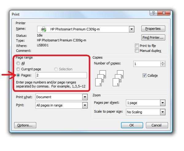 Otra vez, ir al archivo >> imprimir y Compruebe la "páginas:" opción bajo la sección intervalo de páginas. Esta vez, escriba "2" en el cuadro y pulse OK.