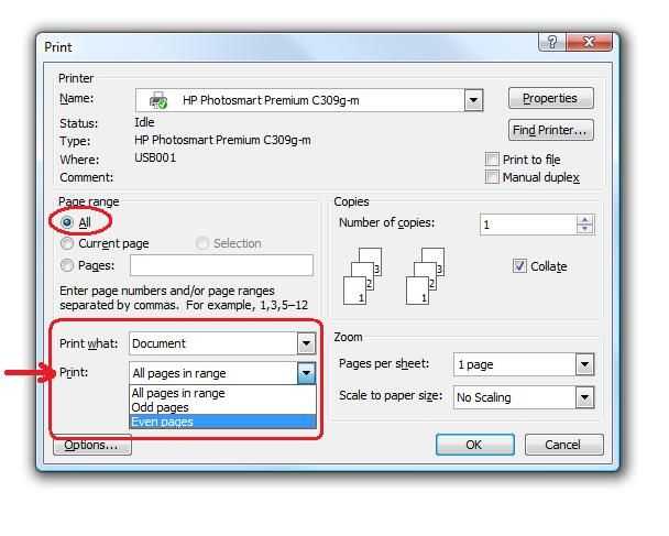 Aparte de esa consideración, toda la pila tendrá que ser hojeado por encima (no rota, apenas hojeado) y volver a cargar en la bandeja de papel. Luego volver al cuadro de diálogo Imprimir y seleccione la opción "Incluso páginas" y haga clic en Aceptar.