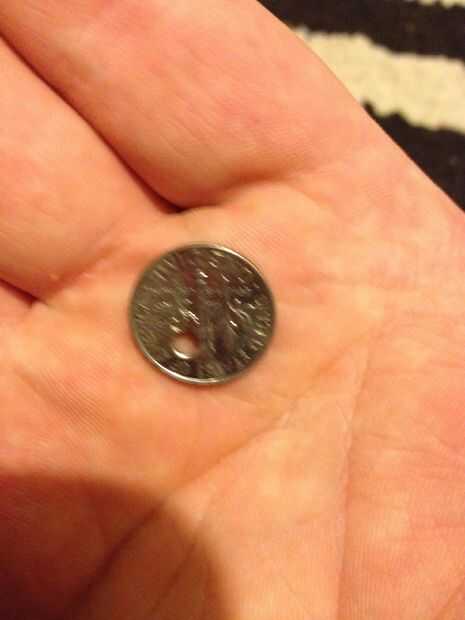 Un taladro o un golpe un juego de matrices funciona muy bien. No desea la moneda centrada como el pendiente se verá extraño. Conjunto de taladro o con un punzón un todo en la periferia de la moneda. Como se ve arriba. Repetir este proceso para hacer dos pendientes para un conjunto.