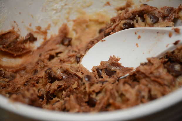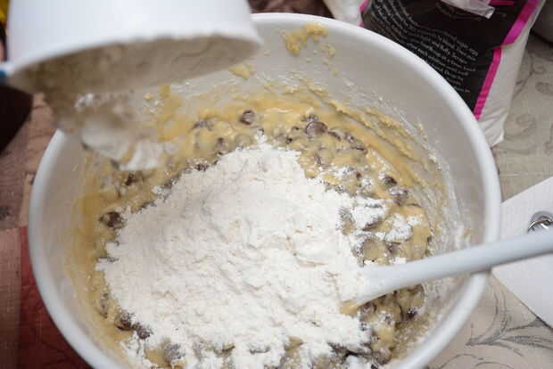 Mezclar todos los ingredientes restantes excepto el cacao en polvo. Ayuda a añadir y mezclar la harina una taza a la vez para reducir el desorden. Ahora puede Agregar el cacao en polvo. No no mezcla en totalmente, sólo mezclarla en suficiente para conseguir un efecto veteado agradable.