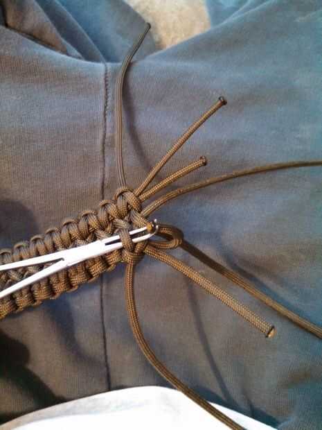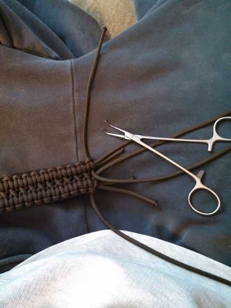 Una vez a la longitud de la correa deseada, tienes que cortar el núcleo exterior línea a cada lado de la hebilla un recorte hasta aproximadamente 1,5 pulgadas más allá del final. Yo uso un par de pinzas hemostáticas para llegar debajo de uno de los lazos de la trenza y puul la línea base a través. Repita este paso hasta las líneas de base estén metidas en bucles de 5 o 6.