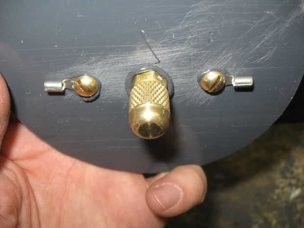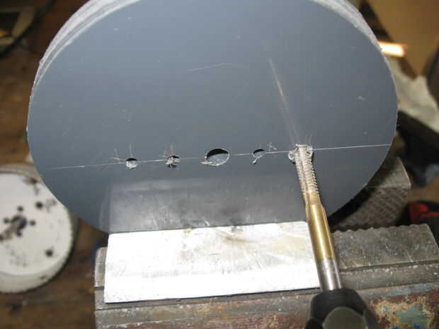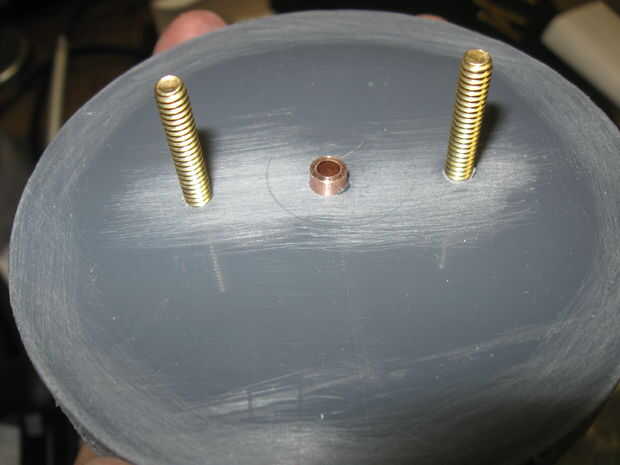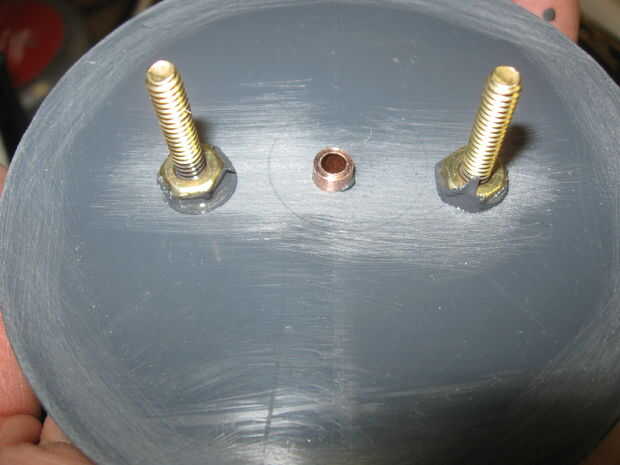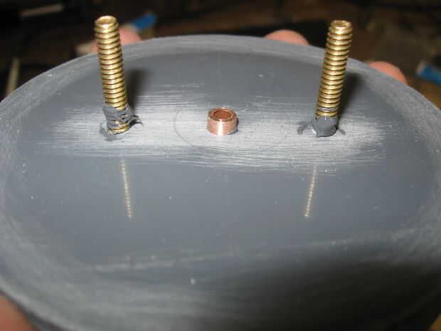 A continuación puse una anilla eléctrica en cada tornillo de 10/24 y thereaded en los agujeros desde el lado exterior del disco ABS. Me coloca una pequeña cantidad de epoxi sobre los hilos luego les atornillan firmemente en el ABS.