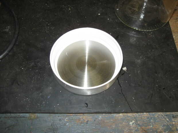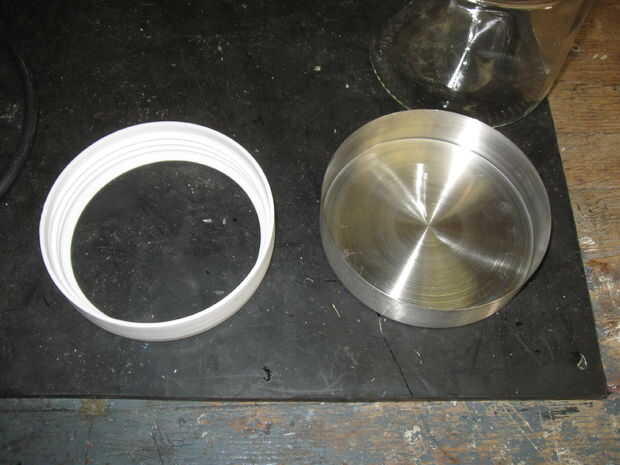 A continuación he utilizado el soldador plástico (epoxi) alrededor del interior perímetro del disco ABS entonces presiona la manga tornillo de tarro sobre el adhesivo. Dio vuelta la manga 1/4 de vuelta completa para obtener una cobertura uniforme con el adhesivo. Entonces alisó el adhesivo que fue aplastado hacia fuera durante el prensado. El sello ocurre principalmente en la jarra borde así que tenga cuidado de suavizar esta zona tanto como sea posible.
