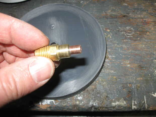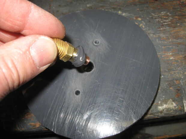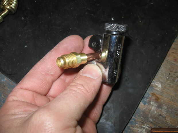 Primero corté el adaptador Schrader que hubo menos de 3/8 de pulgada de cobre tubería adjunta entonces instalar las superficies del adaptador y disco ABS con abrasivo.