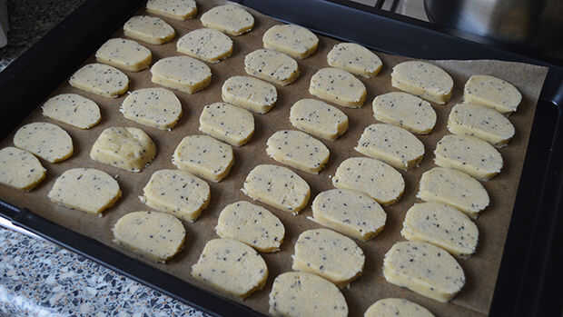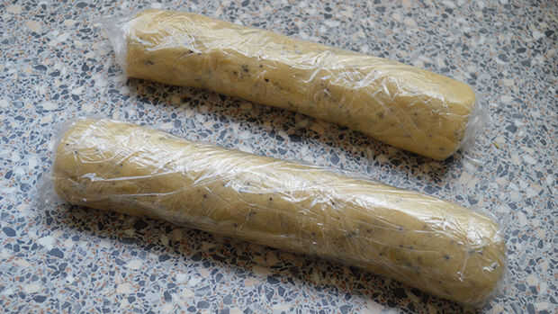 Poner la mantequilla, el azúcar y el extracto de vainilla en un tazón. Amasar con las manos. Las bolsas de té abrir y poner la harina, la sal y el té en el tazón de fuente. Continuar amasando hasta obtener una masa firme para galletas. Dividir la masa en dos partes y hacer largos rollos de las partes. Un rollo largo está bien así, pero encuentro dos piezas más fácil trabajar con. Poner los rollos en un film transparente y ponlos en la nevera por una hora.
