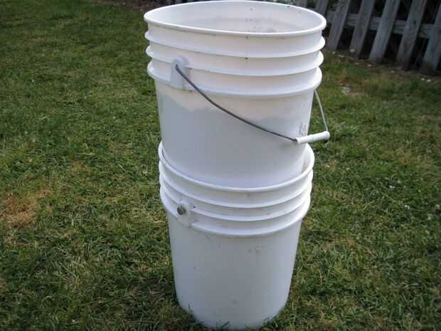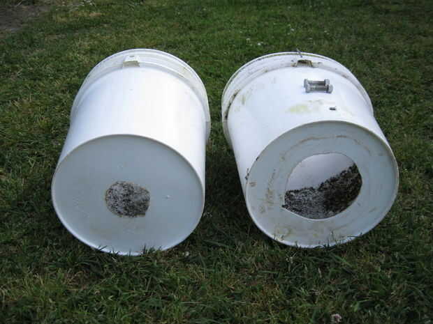 -en este mismo cubo separadas 180 grados, haga dos orificios de 3/8 de pulgada y hasta 3 pulgadas de la parte inferior de la cubeta