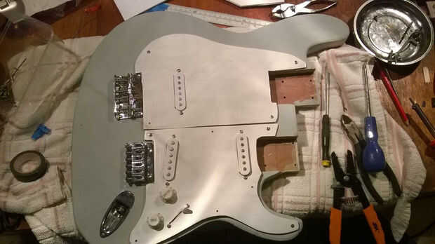Fui para un master volumen y un tono para mantener el cableado más sencillo posible y, como se ha dicho, un selector de strat. Los puentes son fijos - no soy un fan de los brazos del trémolo de todos modos, y me encontré los cables de tierra a ambos. Ambos puentes vinieron de ebay y cuestan unos quid.