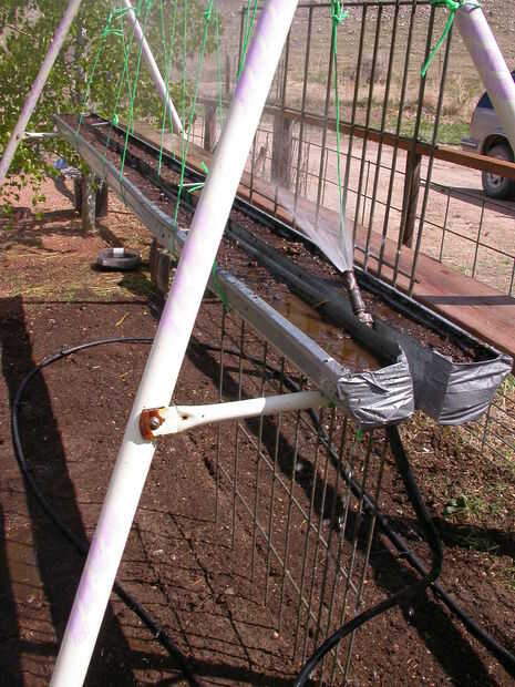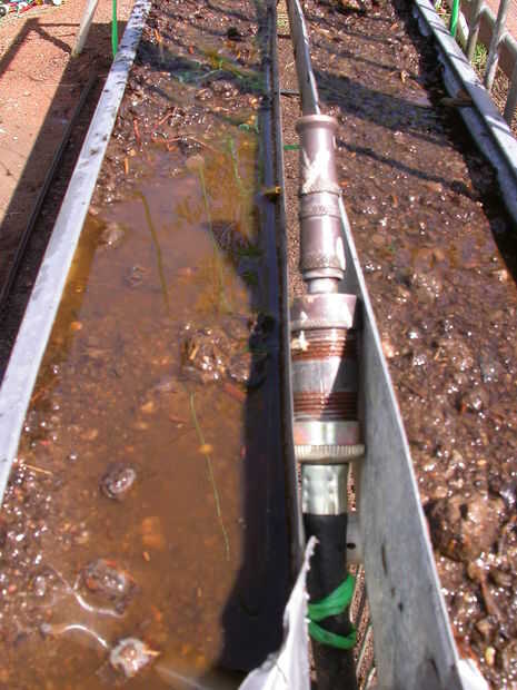 Como notará hay agua estancada en el canal, se trata de un intento fallido por suspender una vieja cabeza de ducha de la barra superior. El flujo no era absolutamente correcto para la aplicación y las conexiones de manguera eran un poco de un dolor, pero antiguos cabezales de ducha pueden tener un propósito en jardinería.