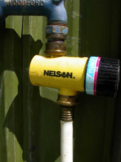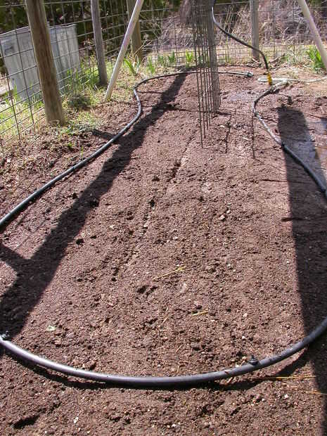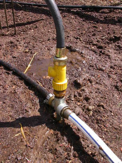 Por ahora, había salvado un pedazo de la línea de goteo para el suelo. La línea de goteo del tubo negro tiene puertos de goteo cada pie y medio. Para regar la capa útil, he añadido un tubo t ' entre la manguera y la línea de goteo. El tubo de ' t ' está conectado a una válvula y una longitud de manguera de lavadora rescatado. La manguera de la lavadora está conectada a un rociador ajustable que es desprendible encajado entre los dos canales. Puesto que el rociador es ajustable, no necesito la válvula. La manguera de la lavadora tiene dos extremos hembra necesitaba una conexión de tubo macho 3/4". En el grifo, he añadido un contador de tiempo pero este temporizador requiere ajuste diario y es más para evitar olvidar cerrar el agua.