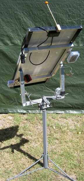Este diseño fue pensado para ser portátil y como tal está montado sobre un soporte pequeño, fácilmente construido durante cortes de energía, etc.. Uso de servos de radio control (NES JR-507) y una pequeña pila niquel-600ma recargable permite aproximadamente 2 ~ 3 días tiempo de ejecución antes de que la batería necesita una recarga.