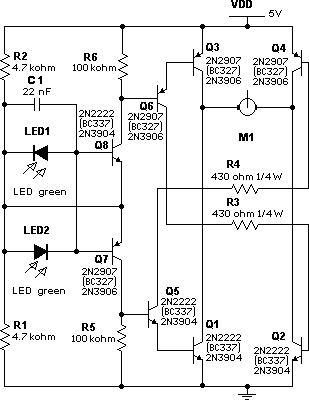 Usé una de 5mm Ultra verde puro claro, 20° debido a la alta, 1.7V tensión bandgap. Es esta tensión de los 2 leds espalda con espalda, que se suma y la diferencia amplificada por los 8 transistores que luego alimenta el motor, por lo que se necesita un alto voltaje posible.