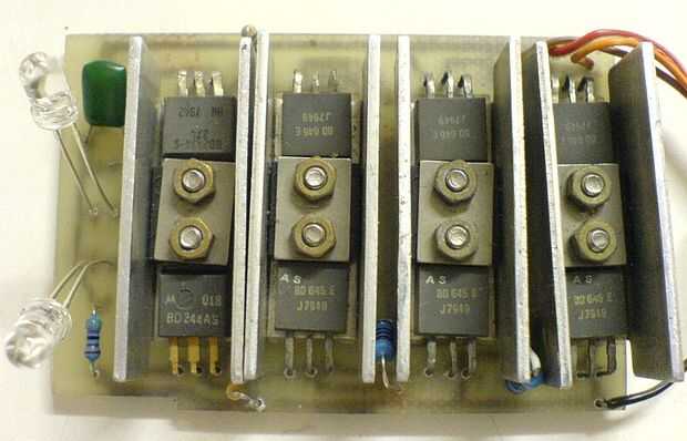 La corriente máxima usando los transistores 2n2222 sugerido es de 100ma, un poco en el lado pequeño para mis motores previstos y así que utilicé algunos de BD634 y 245 que coseché de una vieja máquina de télex. Estos son capaces de 1A y conducirá fácilmente mi RC servo y motor pequeño hobby.