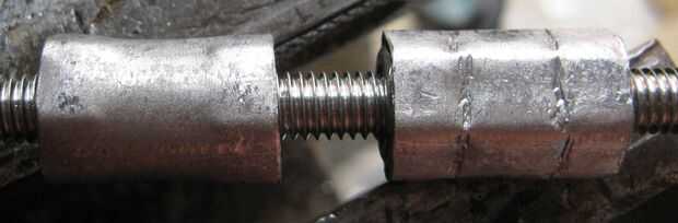 Apreté una tuerca en cada extremo de un tramo de tubo de ss de 12mm (10mm en diámetro) dejando una cintura en el centro que sostiene ambas tuercas cautivas cuando la rosca está atornillada en.